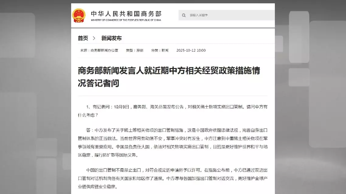 The spokesperson also defended China's recent earth export control measures, saying that China employs export controls on related items according to the law, in order to better defend world peace and regional stability, and to fulfill non-proliferation and other international obligations.