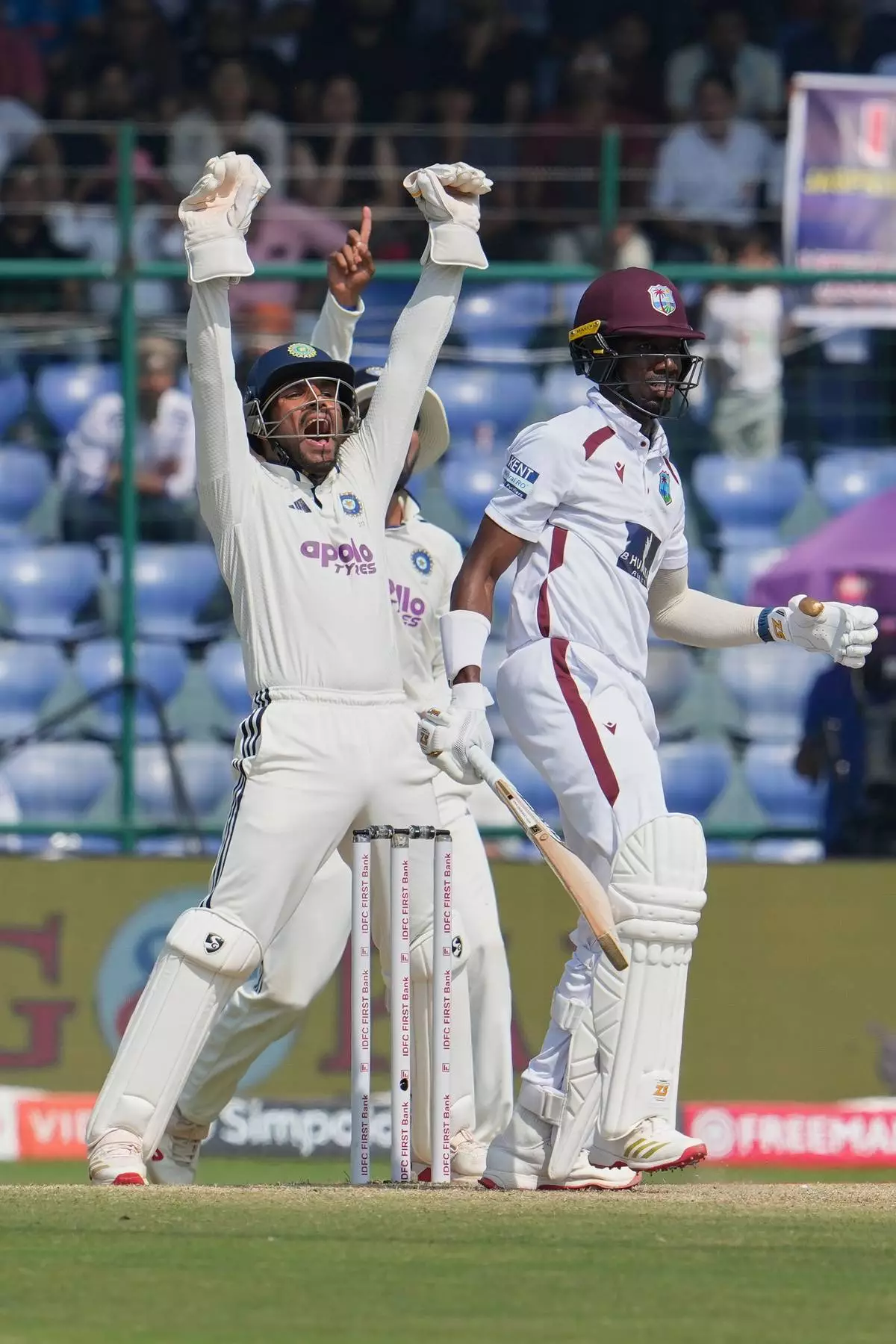 India's wicketkeeper Dhruv Jurel appeals unsuccessfully for the LBW for West Indies' Khary Pierre on the third day of the second cricket test match between India and West Indies at the Arun Jaitley Stadium in New Delhi, India, Sunday, Oct.12, 2025. (AP Photo/Manish Swarup)