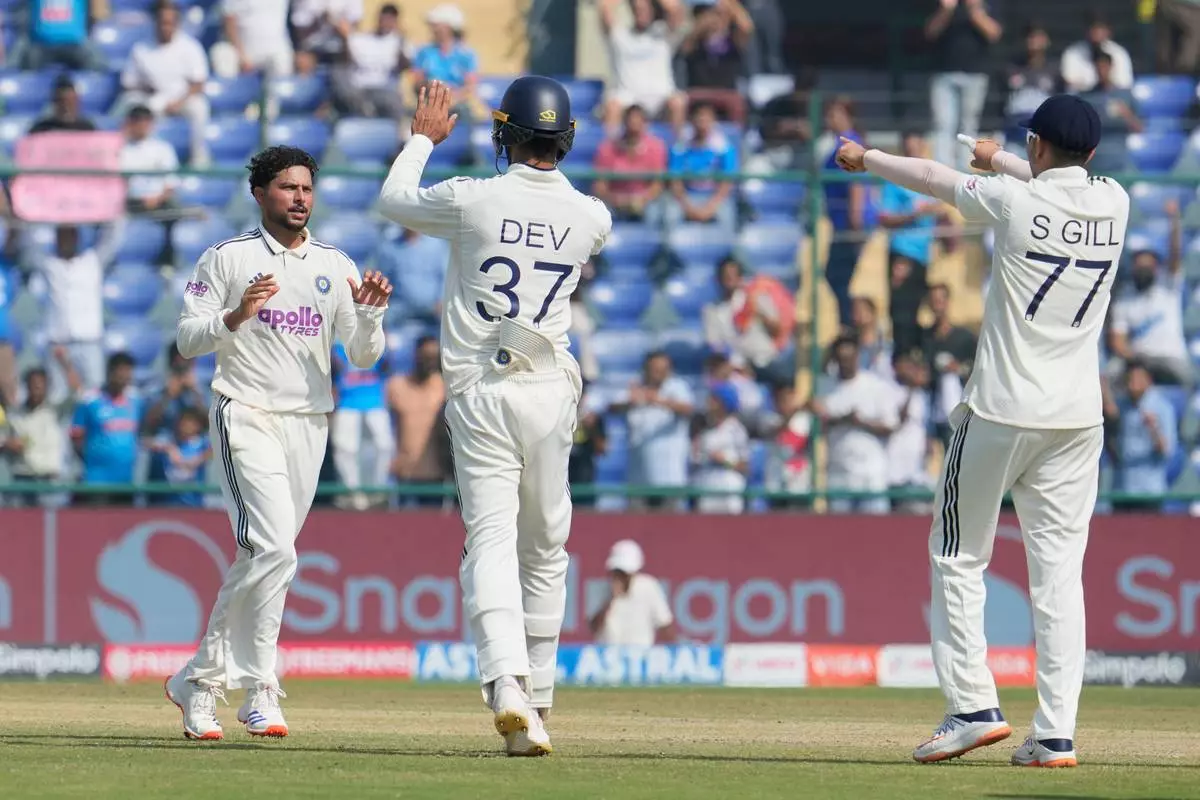 India's Kuldeep Yadav celebrates the dismissal of West Indies' Shai Hope on the third day of the second cricket test match between India and West Indies at the Arun Jaitley Stadium in New Delhi, India, Sunday, Oct.12, 2025. (AP Photo/Manish Swarup)