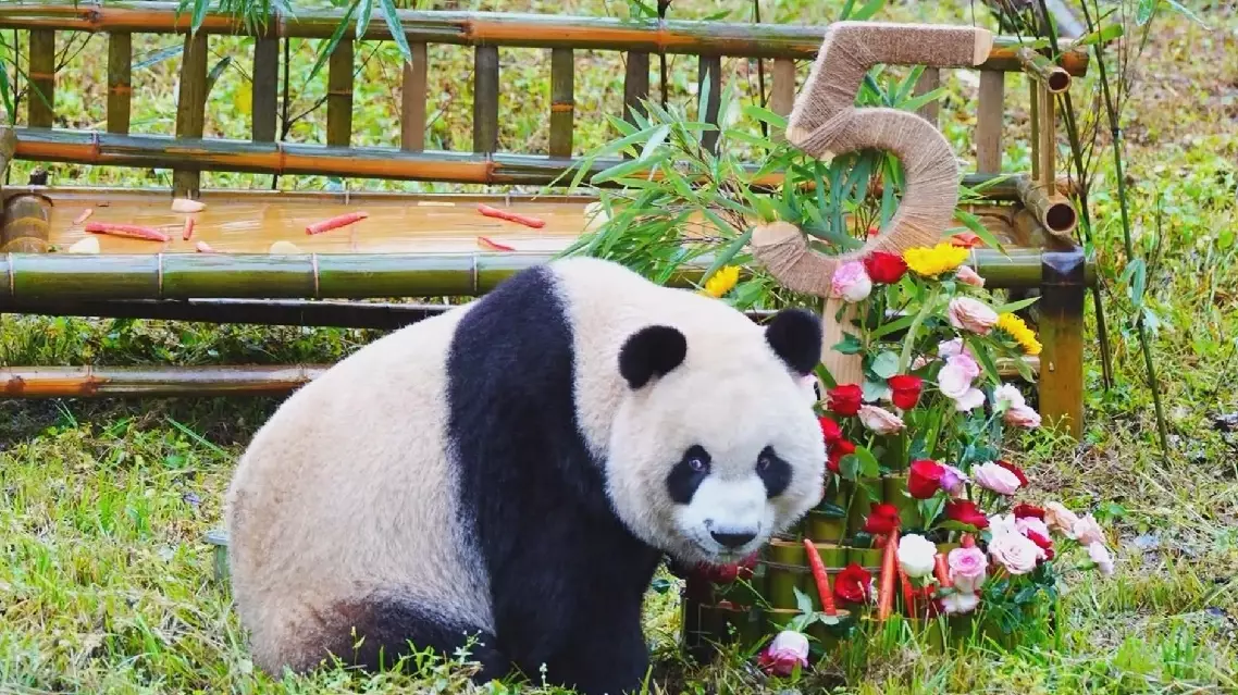 Giant Panda Qin Hua celebrated his fifth birthday at the Huayang Mountain Scenic Area in Hanzhong City, northwest China's Shaanxi Province on Saturday.