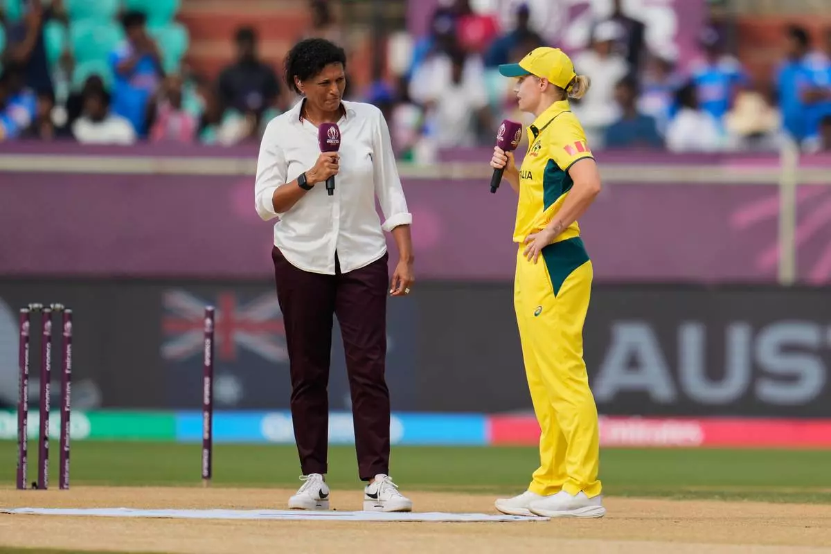 Australia's captain Alyssa Healy, right, speaks to former Australian cricketer and commentator Mel Jones after the coin toss ahead of the ICC Women's Cricket World Cup match between India and Australia at ACA-VDCA Cricket Stadium in Visakhapatnam, India, Sunday, Oct. 12, 2025. (AP Photo/Aijaz Rahi)
