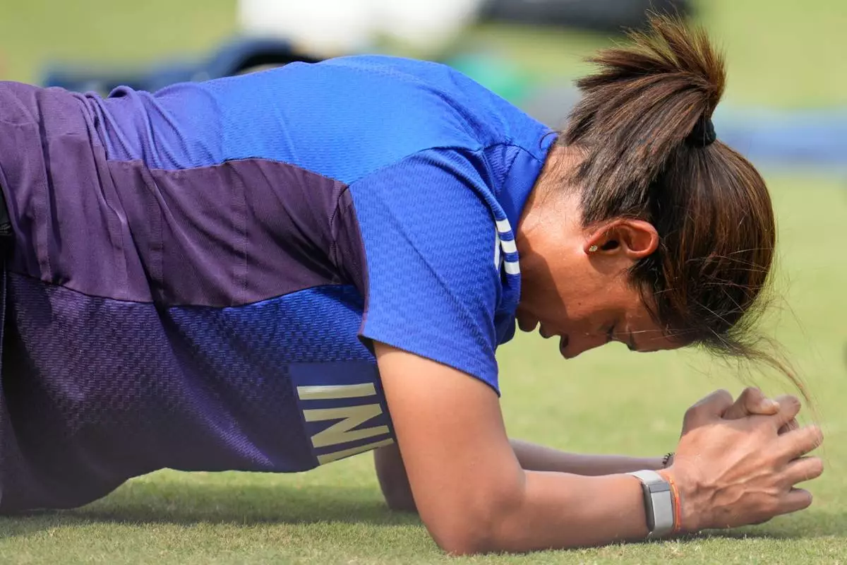 India's captain Harmanpreet Kaur trains ahead of the ICC Women's Cricket World Cup match between India and Australia at ACA-VDCA Cricket Stadium in Visakhapatnam, India, Sunday, Oct. 12, 2025. (AP Photo/Aijaz Rahi)