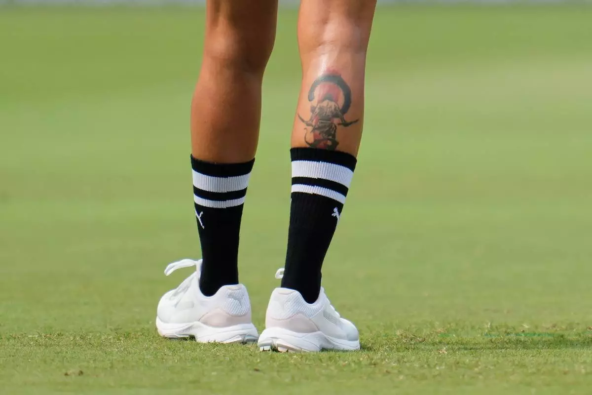 A tattoo is seen on the leg of India's captain Harmanpreet Kaur as she trains ahead of the ICC Women's Cricket World Cup match between India and Australia at ACA-VDCA Cricket Stadium in Visakhapatnam, India, Sunday, Oct. 12, 2025. (AP Photo/Aijaz Rahi)