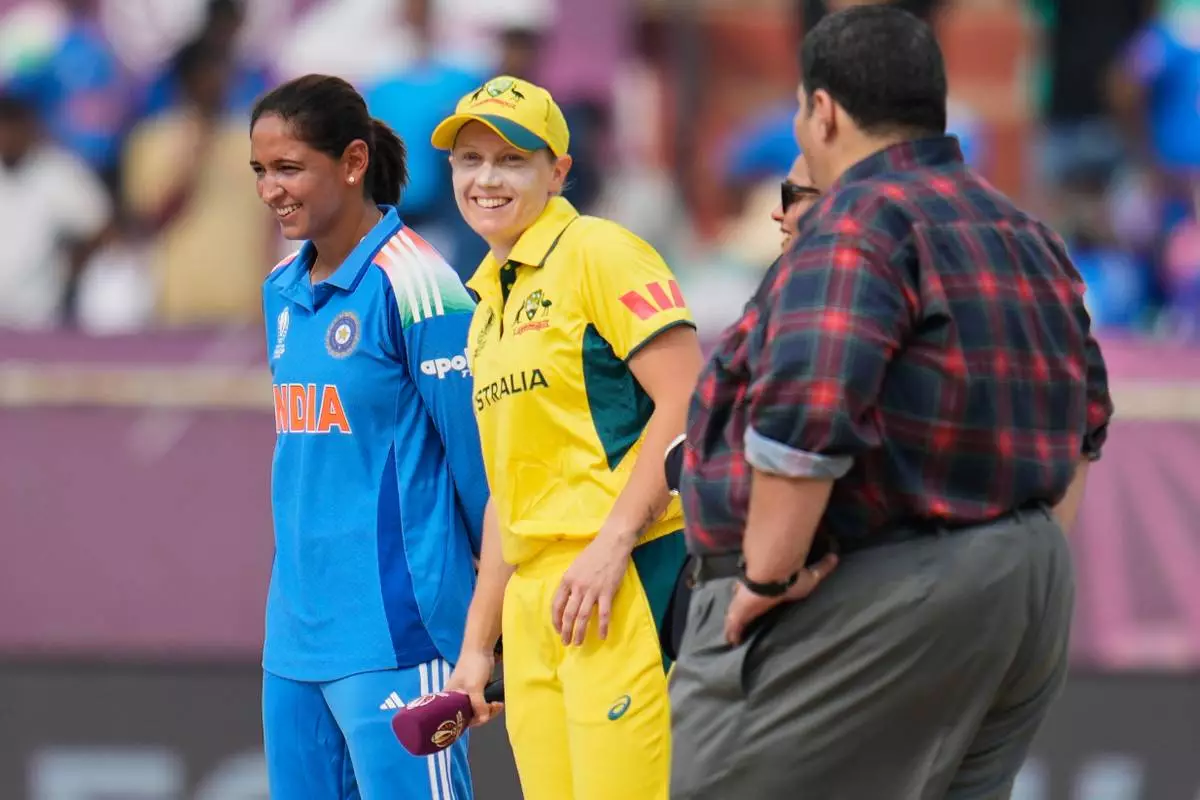 India's captain Harmanpreet Kaur, left, and Australia's captain Alyssa Healy at the coin toss ahead of the ICC Women's Cricket World Cup match between India and Australia at ACA-VDCA Cricket Stadium in Visakhapatnam, India, Sunday, Oct. 12, 2025. (AP Photo/Aijaz Rahi)