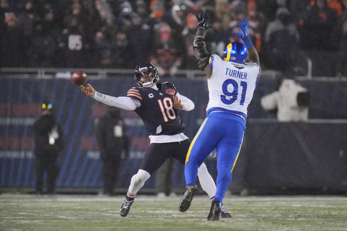 Chicago Bears quarterback Caleb Williams (18) throws a pass as Los Angeles Rams defensive end Kobie Turner (91) applies pressure during the second half of an NFL football divisional playoff game Sunday, Jan. 18, 2026, in Chicago. (AP Photo/Jeff Roberson)
