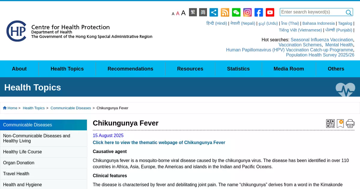 The Centre for Health Protection (CHP) of the Department of Health announced that as of 5pm today (October 12), one new case of chikungunya fever (CF) had been recorded.