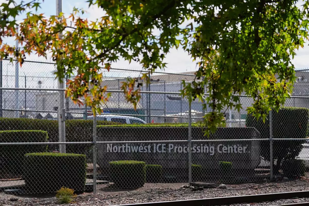 The entrance to the Northwest U.S. Immigration and Customs Enforcement Processing Center is seen, Aug. 13, 2025, in Tacoma, Wash. (AP Photo/Lindsey Wasson)