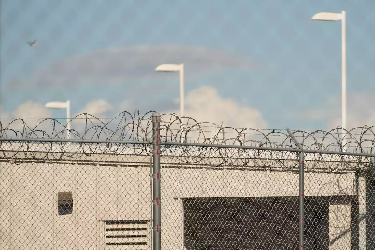 Barbed wire is seen through chain link fences at the Northwest U.S. Immigration and Customs Enforcement Processing Center, Aug. 13, 2025, in Tacoma, Wash. (AP Photo/Lindsey Wasson)