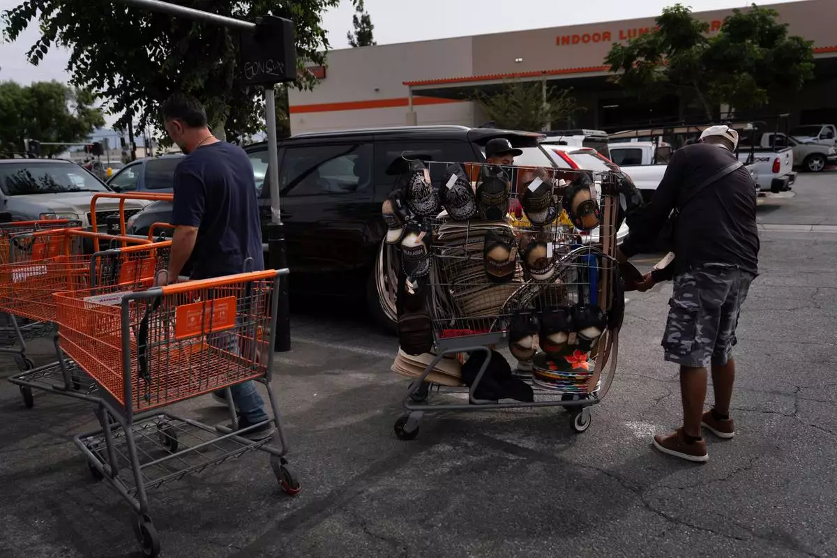 FILE - Vendor Felix, right, shows merchandise to a man as a shopper returns a cart in the parking lot of a Home Depot in the Van Nuys section of Los Angeles, Aug. 28, 2025. (AP Photo/Jae C. Hong, File)