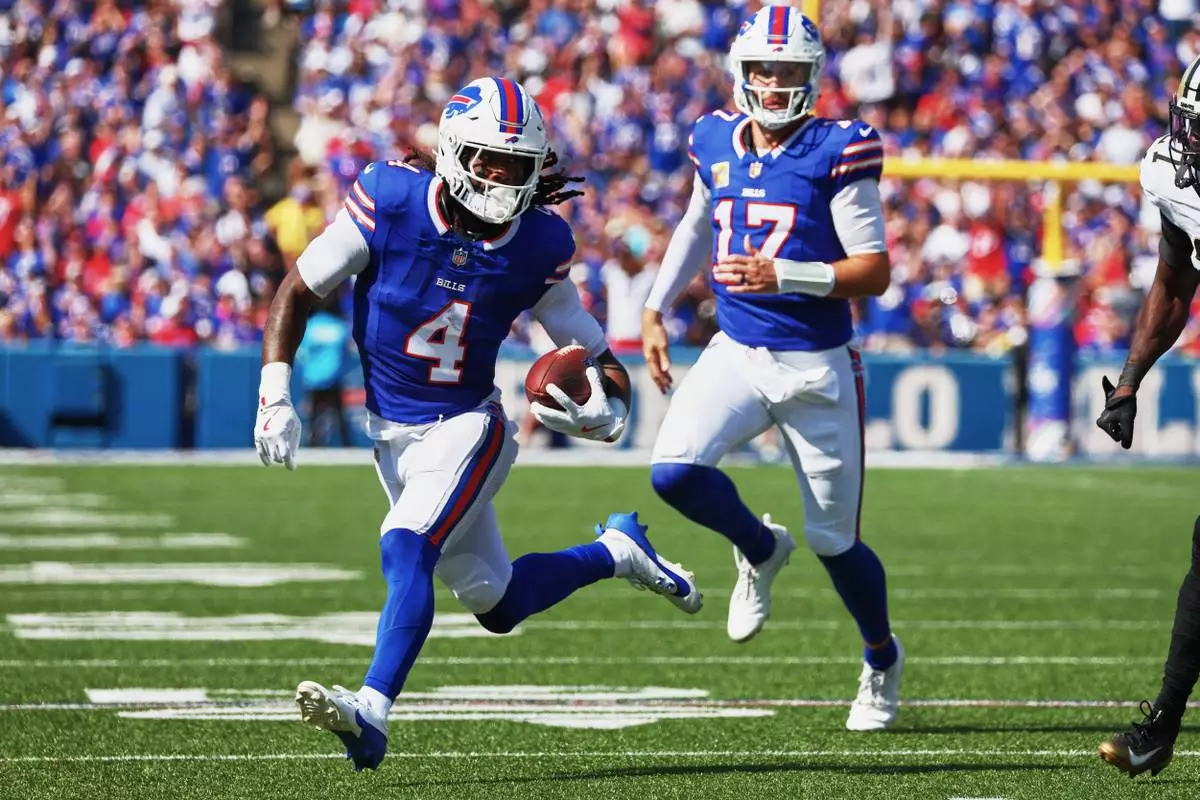 Buffalo Bills running back James Cook (4) carries against the New Orleans Saints in the first half of an NFL football game, Sunday, Sept. 28, 2025, in Orchard Park, N.Y. (AP Photo/Jeffrey T. Barnes)
