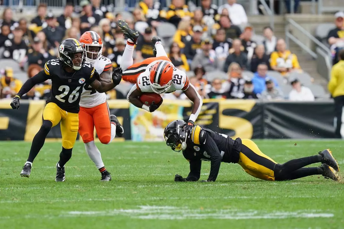Cleveland Browns running back Dylan Sampson (22) is upended by Pittsburgh Steelers safety Juan Thornhill, right, on a kick off return after a field goal in the first half of an NFL football game in Pittsburgh, Sunday, Oct. 12, 2025. (AP Photo/Matt Freed)
