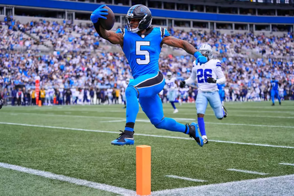Carolina Panthers running back Rico Dowdle (5) runs the ball for a touchdown in the second half of an NFL football game against the Dallas Cowboys, Sunday, Oct. 12, 2025, in Charlotte, N.C. (AP Photo/Erik Verduzco)