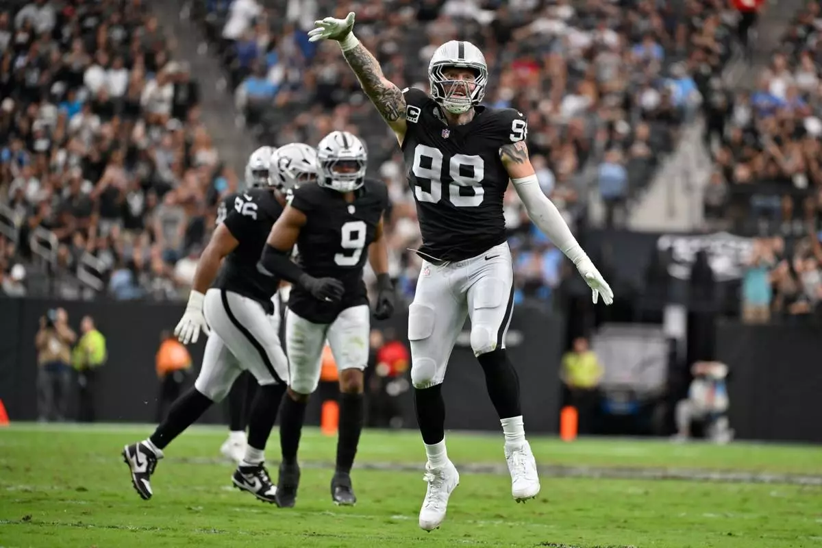 Las Vegas Raiders defensive end Maxx Crosby (98) celebrates after sacking Tennessee Titans quarterback Cam Ward during the first half of an NFL football game, Sunday, Oct. 12, 2025, in Las Vegas. (AP Photo/David Becker)