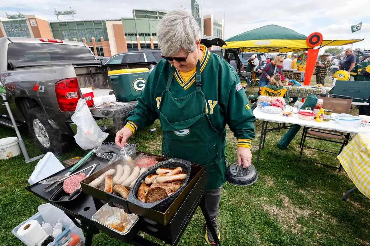 Mary Schroeder, of Morgan, Wis, cooks before an NFL football game between the Green Bay Packers and the Cincinnati Bengals, Sunday, Oct. 12, 2025, in Green Bay, Wis. (AP Photo/Mike Roemer)