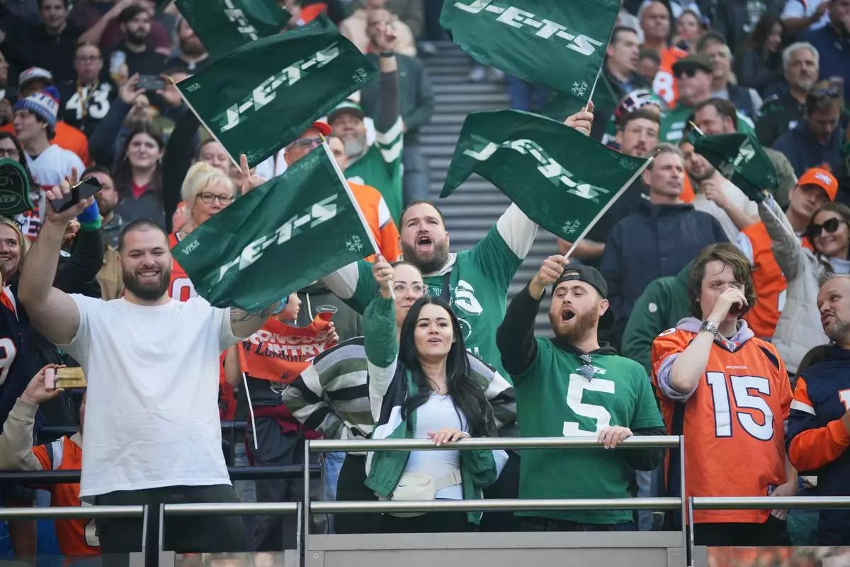 New York Jets fans cheer during the first half of an NFL football game against the Denver Broncos Sunday, Oct. 12, 2025, in London. (AP Photo/Kin Cheung)