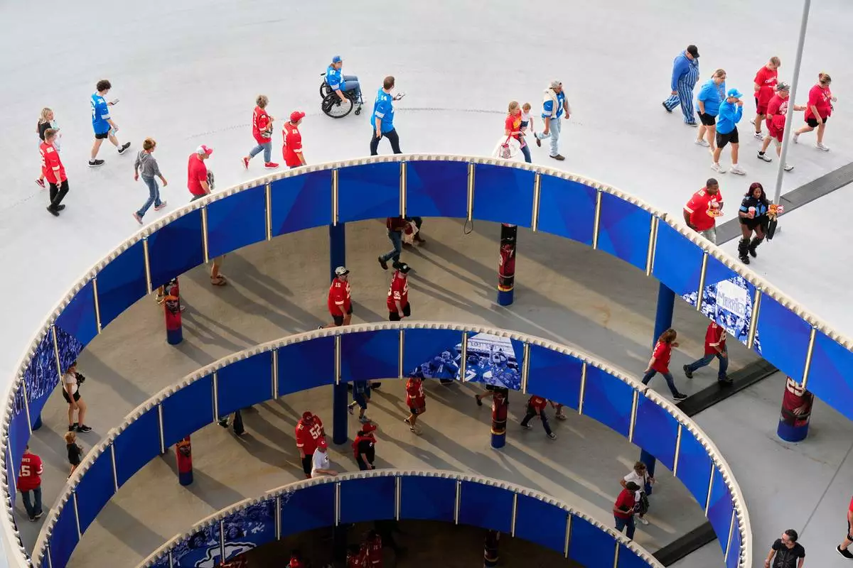Fans walk up a ramp leading to a seating area inside Arrowhead Stadium before an NFL football game between the Kansas City Chiefs and the Detroit Lions Sunday, Oct. 12, 2025, in Kansas City, Mo. (AP Photo/Charlie Riedel)