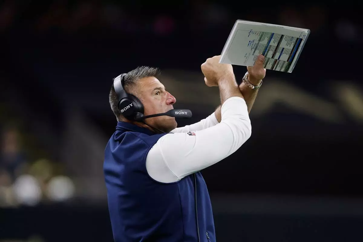 New England Patriots head coach Mike Vrabel reacts during the second half of an NFL football game against the New Orleans Saints, Sunday, Oct. 12, 2025, in New Orleans. (AP Photo/Butch Dill)