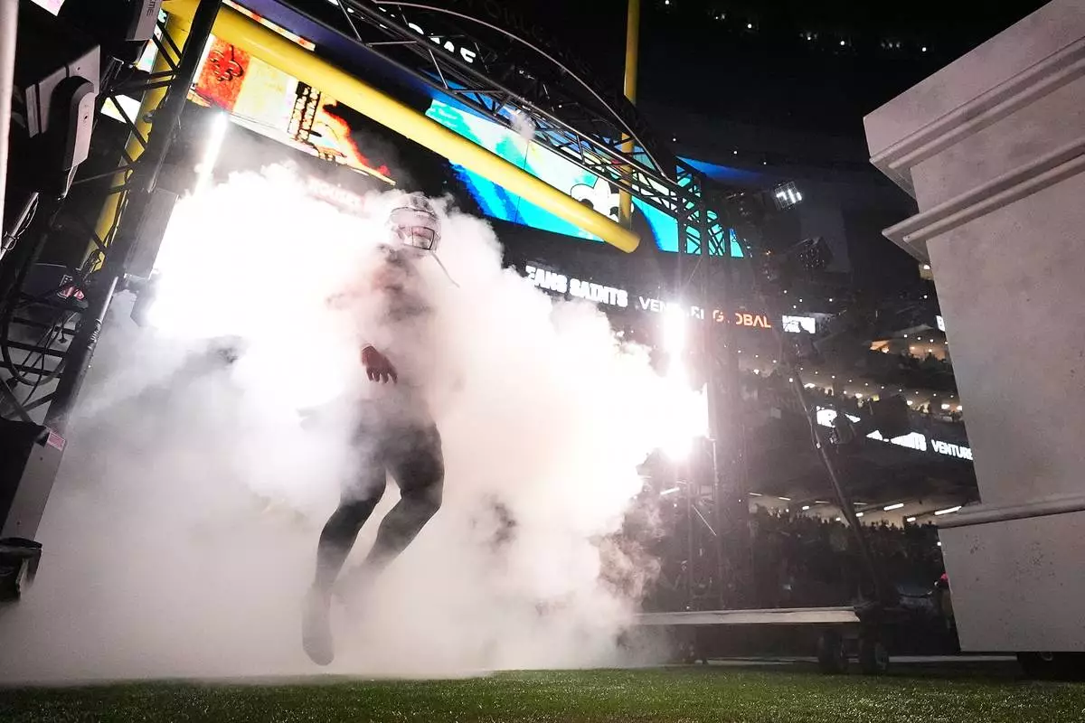 New Orleans Saints tight end Taysom Hill runs onto the field before an NFL football game against the New England Patriots, Sunday, Oct. 12, 2025, in New Orleans. (AP Photo/Gerald Herbert)