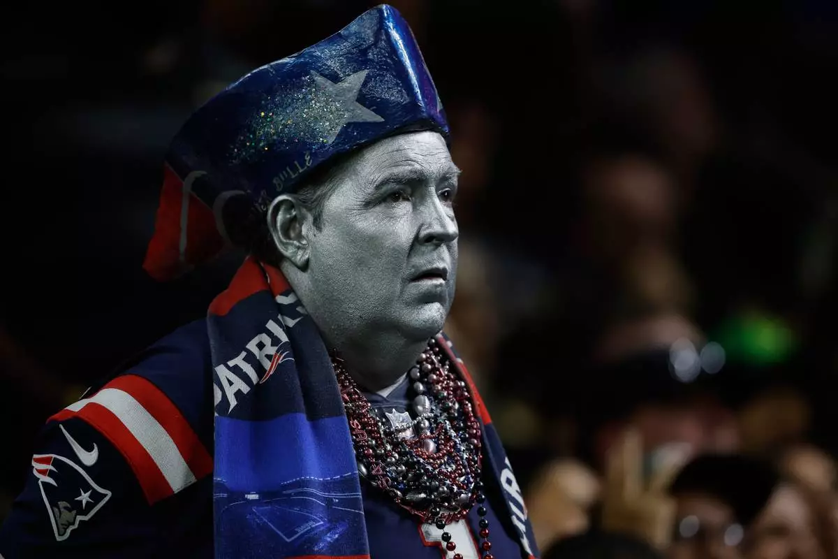 A New England Patriots fan reacts from the stands during the first half of an NFL football game against the New Orleans Saints, Sunday, Oct. 12, 2025, in New Orleans. (AP Photo/Butch Dill)
