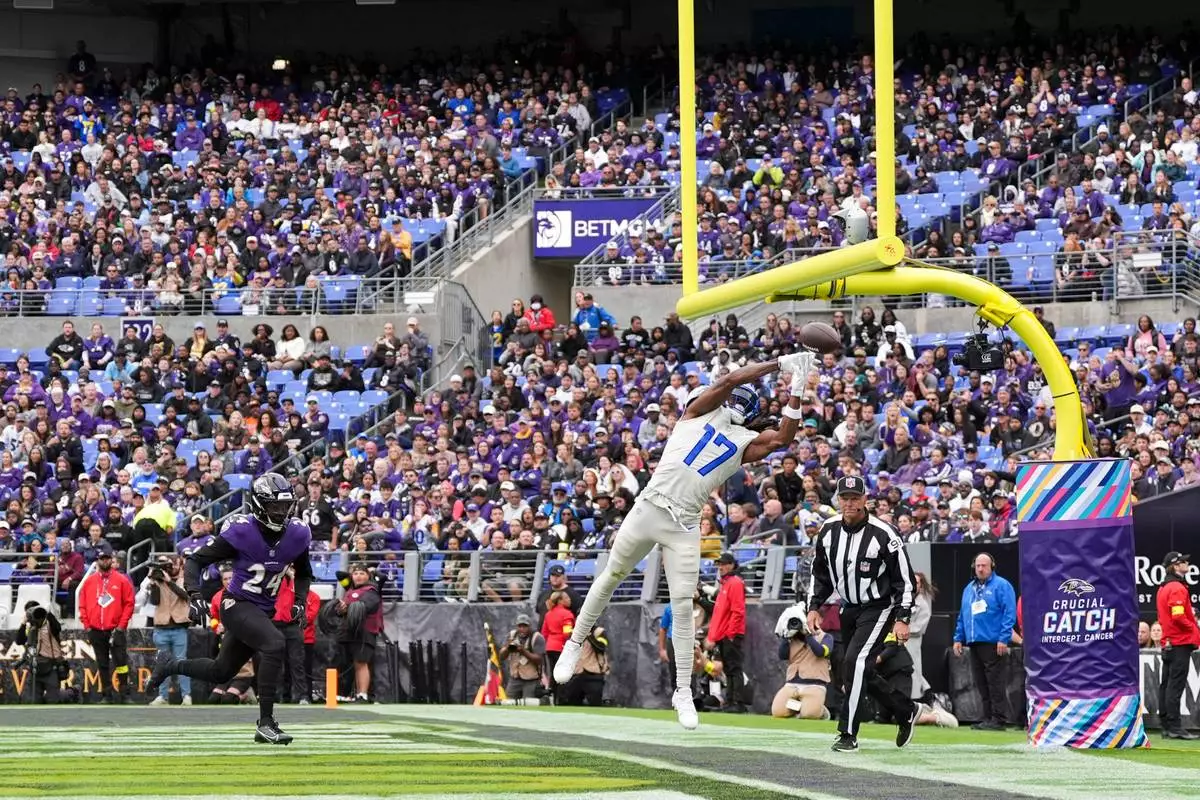 Los Angeles Rams wide receiver Davante Adams (17) attempts to make catch in the end zone as Baltimore Ravens safety Malaki Starks (24) covers during the first half of an NFL football game Sunday, Oct. 12, 2025, in Baltimore. (AP Photo/Stephanie Scarbrough)