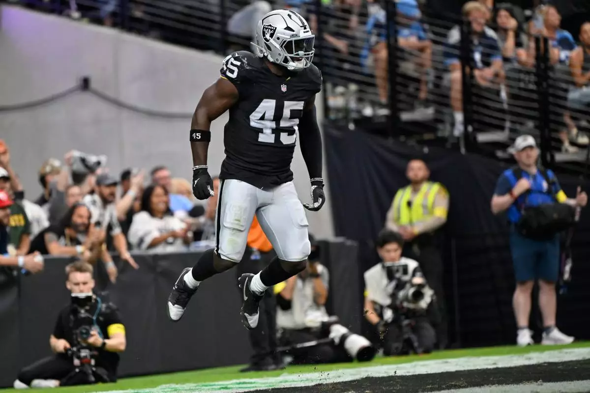Las Vegas Raiders linebacker Devin White (45) celebrates after forcing a fumble by the Tennessee Titans during the first half of an NFL football game, Sunday, Oct. 12, 2025, in Las Vegas. (AP Photo/Rick Scuteri)