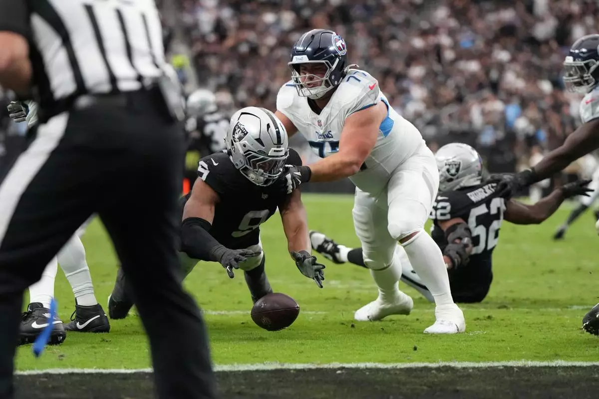 Las Vegas Raiders defensive end Tyree Wilson (9) recovers a fumble by the Tennessee Titans during the first half of an NFL football game, Sunday, Oct. 12, 2025, in Las Vegas. (AP Photo/Rick Scuteri)