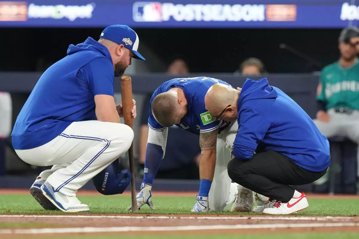 Toronto Blue Jays manager John Schneider, left, and a trainer talk with Nathan Lukes, centre, after he was hit by the ball during first inning American League Championship Series baseball action against the Seattle Mariners in Toronto on Sunday, Oct. 12, 2025. (Chris Young/The Canadian Press via AP)