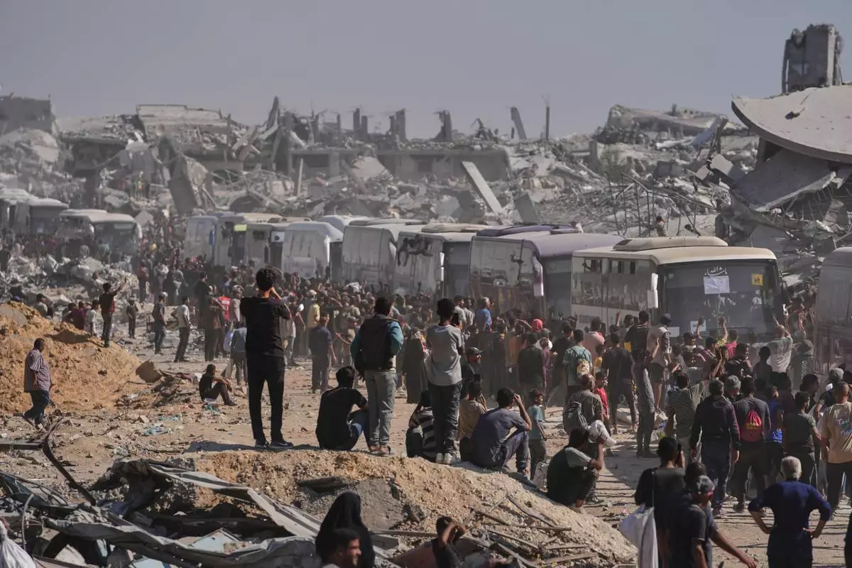 Buses carrying freed Palestinian prisoners drive past destroyed buildings in the Gaza Strip after their release from Israeli jails under a ceasefire agreement between Hamas and Israel, in Khan Younis, southern Gaza Strip, Monday, Oct. 13, 2025. (AP Photo/Jehad Alshrafi)