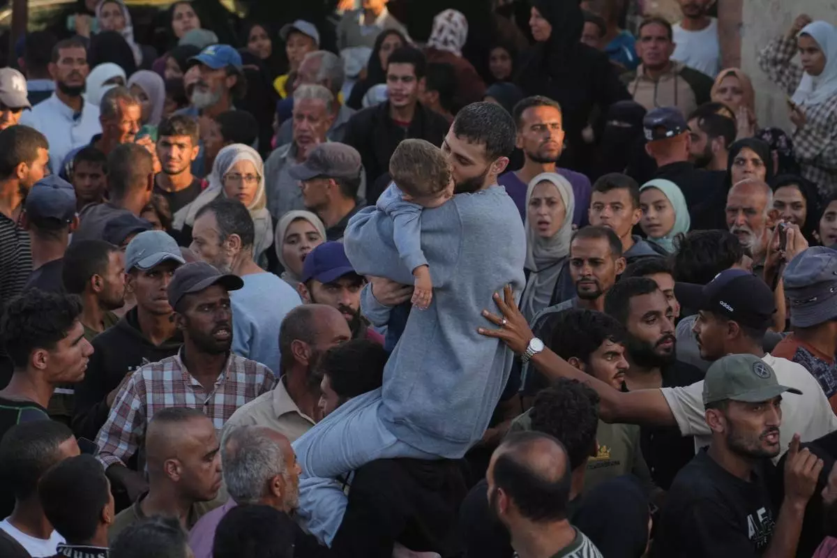 A freed Palestinian prisoner, center, hugs a child as he is greeted upon arriving in the Gaza Strip after being released from Israeli jails under a ceasefire agreement between Hamas and Israel, in Khan Younis, southern Gaza Strip, Monday, Oct. 13, 2025. (AP Photo/Jehad Alshrafi)