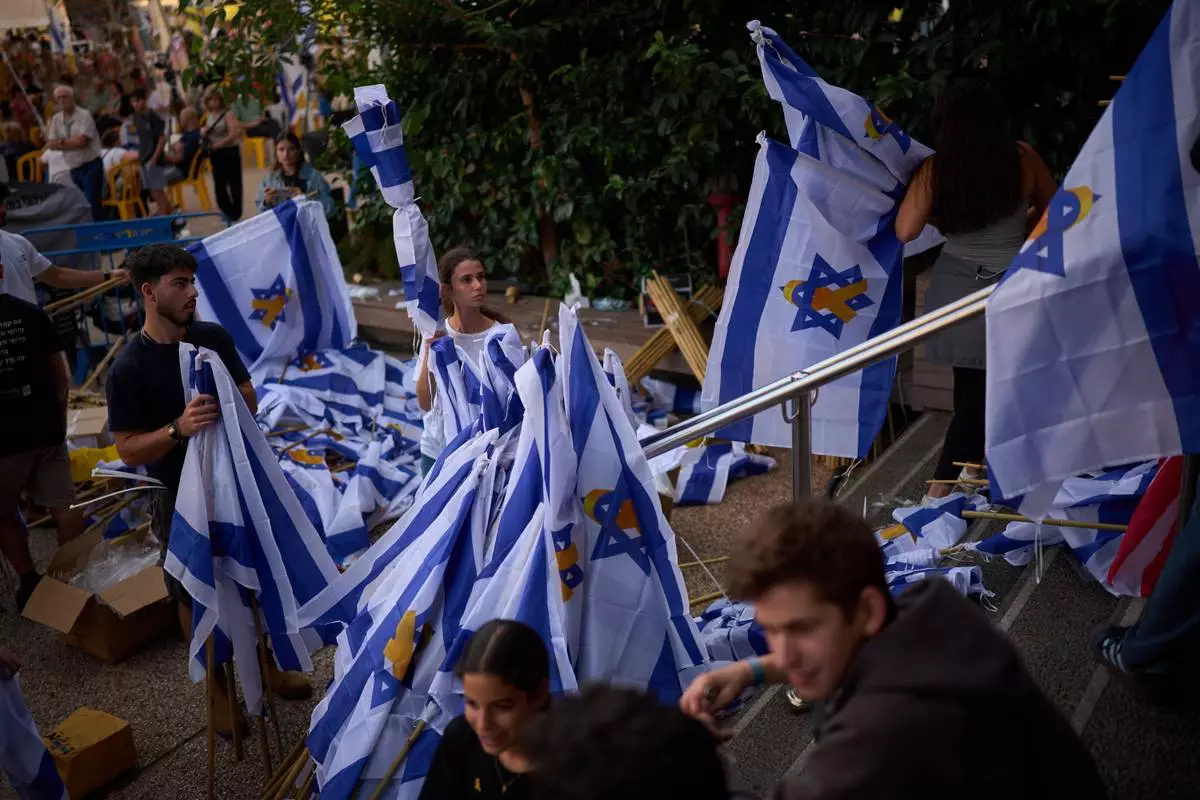 Volunteers prepare Israeli flags as people gather at a plaza known as hostages square, in Tel Aviv, Israel, Sunday, Oct. 12, 2025. (AP Photo/Emilio Morenatti)
