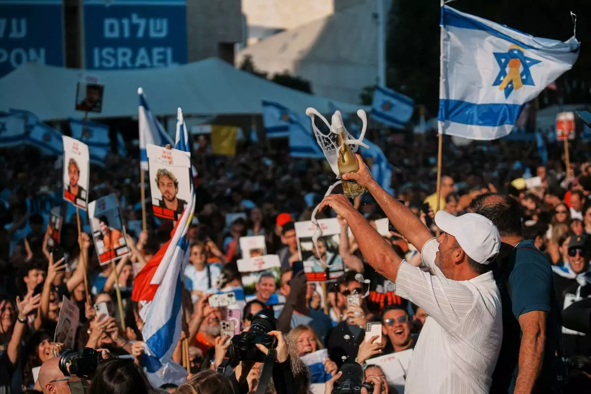 Attendees listen to a concert at a plaza known as hostages square, in Tel Aviv, Israel, Sunday, Oct. 12, 2025. (AP Photo/Emilio Morenatti)