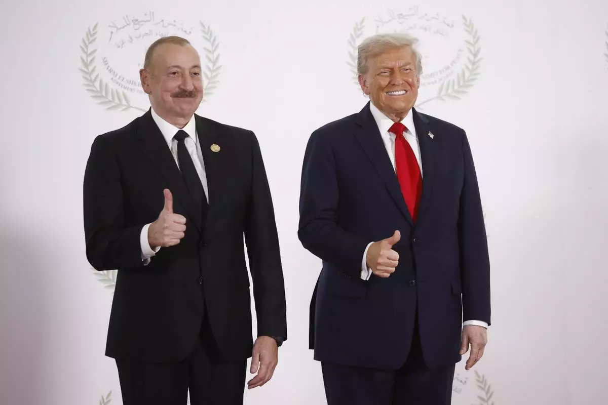 Azerbaijani President Ilham Aliyev and President Donald Trump pose during the greetings ceremony before the family picture at the Gaza International Peace Summit, in Sharm el-Sheikh, Egypt, Monday, Oct.13 2025. (Yoan Valat, Pool photo via AP)