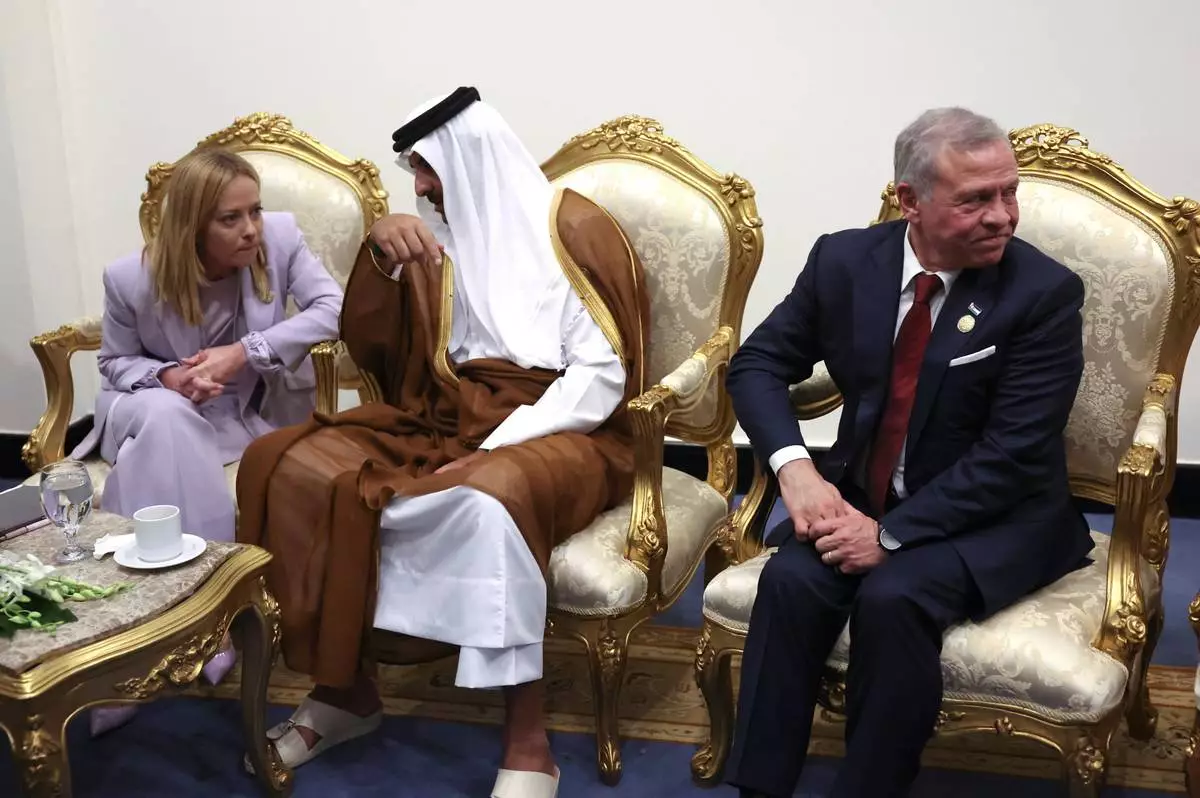 From left, Italy's Prime Minister Giorgia Meloni, Emir of Qatar Sheikh Tamim ibn Hamad Al Thani and Jordan's King Abdullah meet before attending a world leaders' summit on ending the Gaza war, in Sharm el-Sheikh, Egypt, Monday, Oct. 13, 2025. (Suzanne Plunkett, Pool Photo via AP)