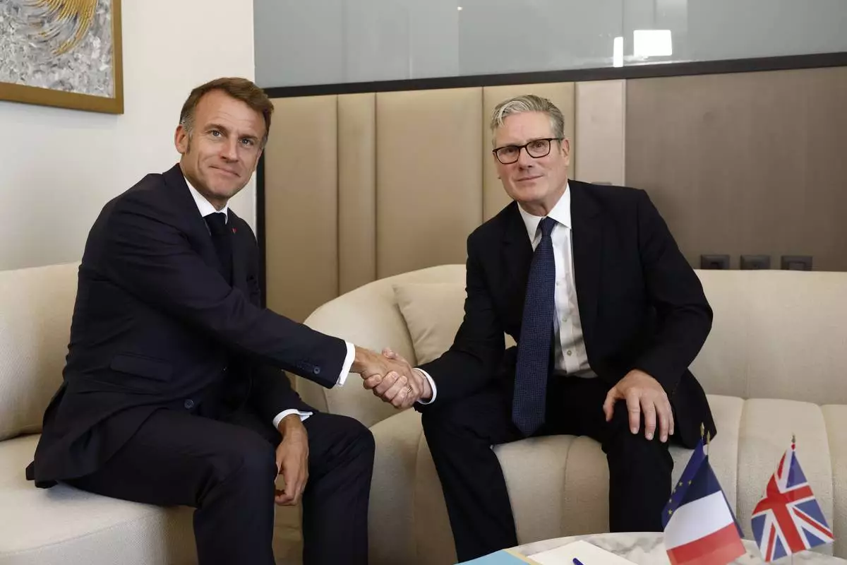 French President Emmanuel Macron, left, attends a bilateral meeting with British Prime Minister Keir Starmer on the sidelines of the Gaza International Peace Summit, in Sharm el-Sheikh, Egypt, Monday, Oct.13 2025. (Yoan Valat, Pool photo via AP)