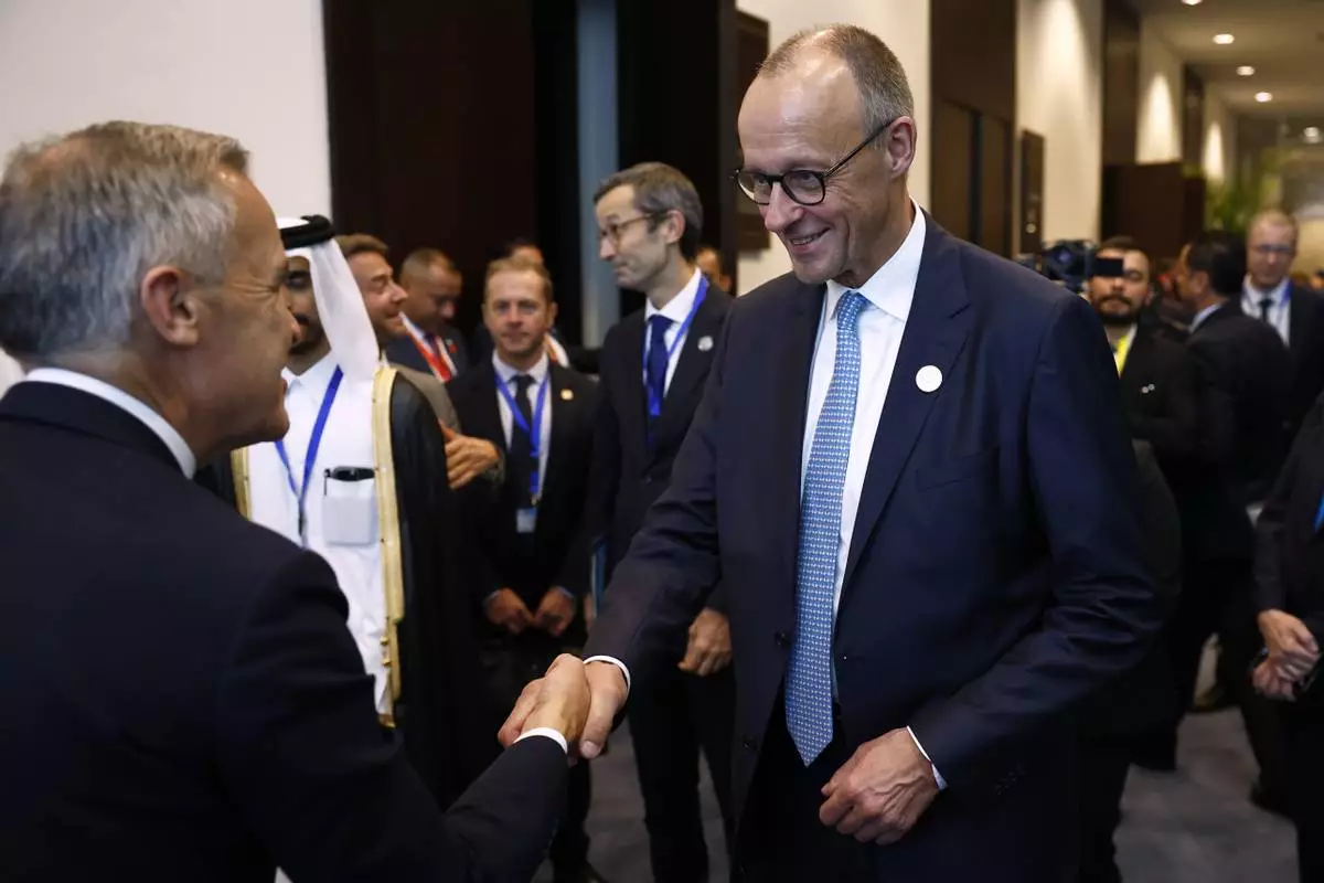 German Chancellor Freidrich Merz meets meets Canadian Prime Minister Mark Carney, left, at the Gaza International Peace Summit, in Sharm el-Sheikh, Egypt, Monday, Oct.13 2025. (Yoan Valat, Pool photo via AP)