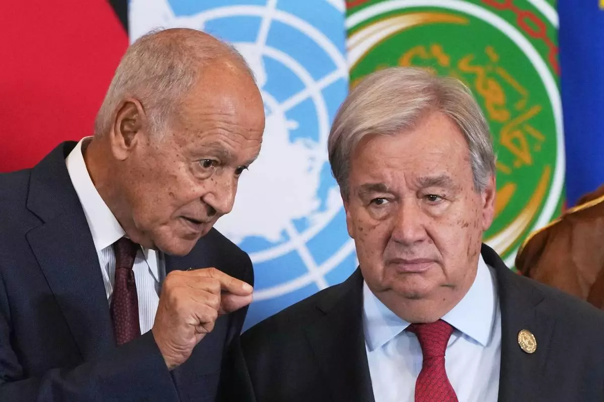 UN Secretary-General Antonio Guterres, right, listens to Arab League Secretary-General Ahmed Aboul Gheit during a summit to support ending the Israel-Hamas war in Gaza after a ceasefire deal, Monday, Oct. 13, 2025, in Sharm El Sheikh, Egypt. (AP Photo/Amr Nabil)