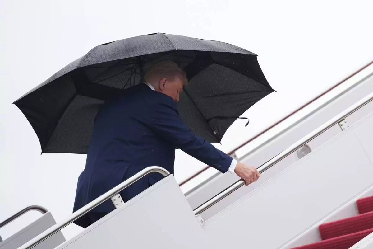 President Donald Trump boards Air Force One, Sunday, Oct. 12, 2025, at Joint Base Andrews, Md.., as he heads to the Middle East. (AP Photo/Evan Vucci)