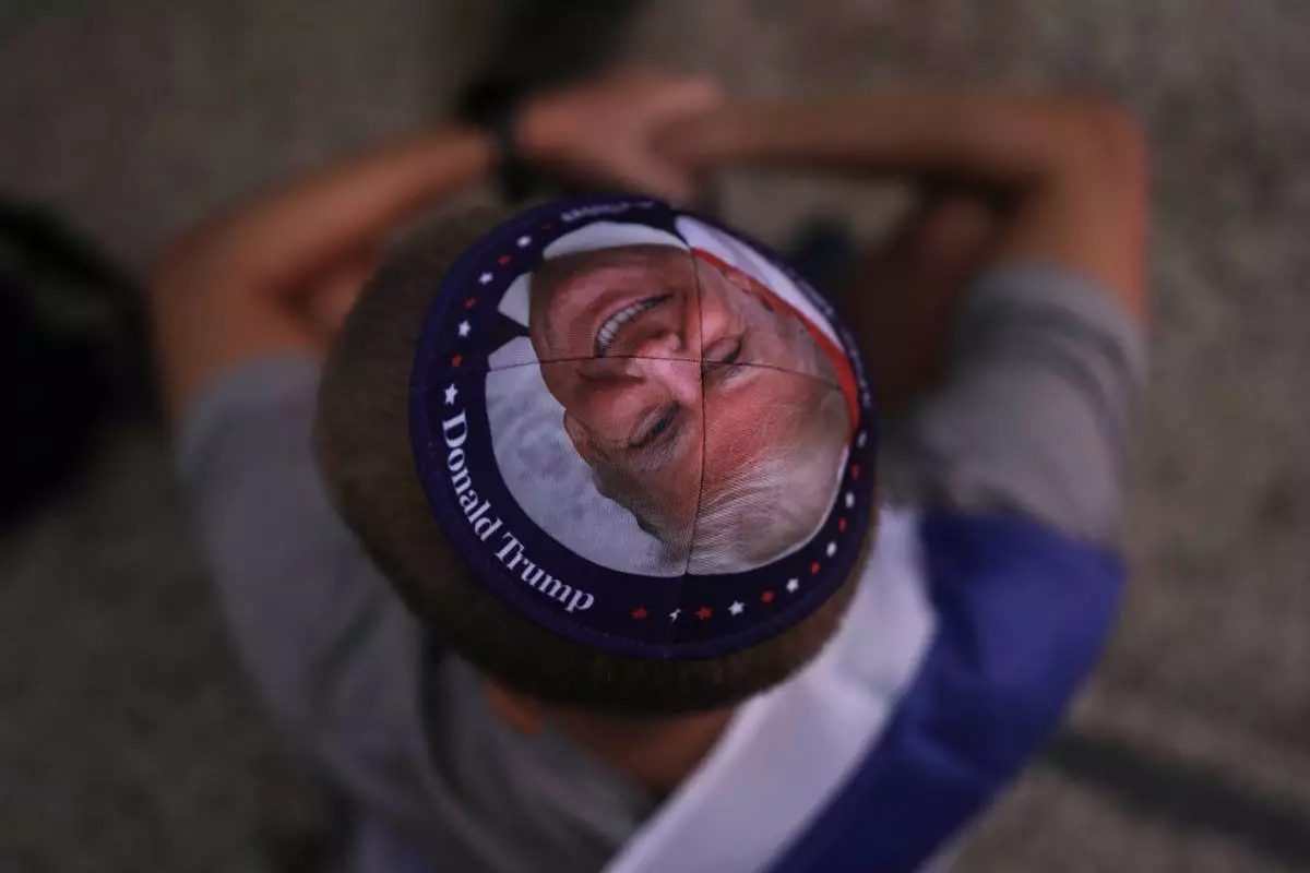 A Jewish man wears a kippah printed with the image of U.S. President Donald Trump during a gathering at a plaza known as hostages square in Tel Aviv, Israel, Monday, Oct. 13, 2025, before the release of Israeli hostages held in Gaza. (AP Photo/Oded Balilty)