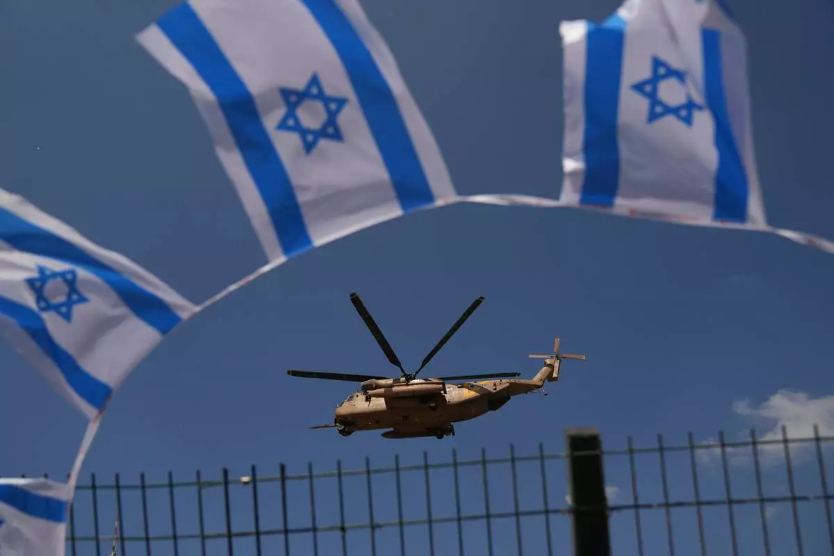 People wave Israeli flags as a military helicopter carrying Israeli freed hostages arrives at Beilinson hospital in Petah Tikva, Israel, after they were released from Hamas captivity in the Gaza Strip, Monday, Oct. 13, 2025. (AP Photo/Ariel Schalit)