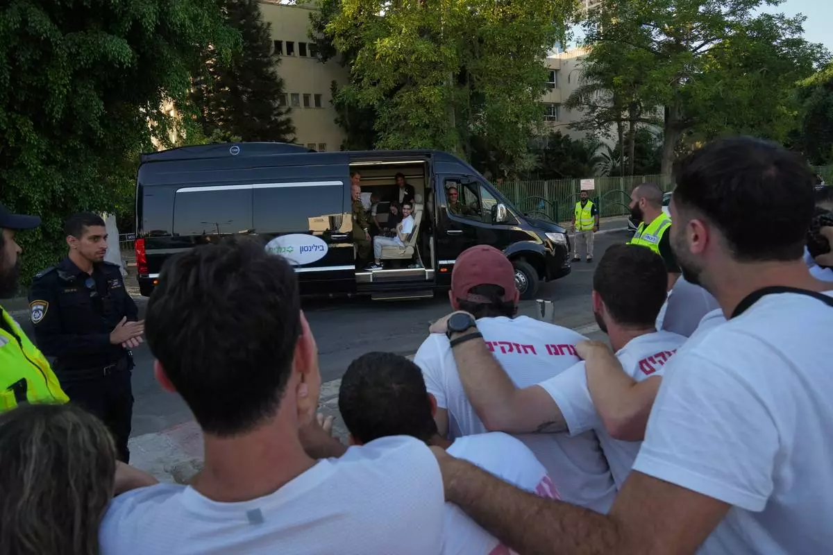 David Cunio, an Israeli hostage released from the Gaza Strip gestures from a minibus at the Sheba Medical Center in Ramat Gan, Israel, Monday, Oct. 13, 2025. (AP Photo/Leo Correa)