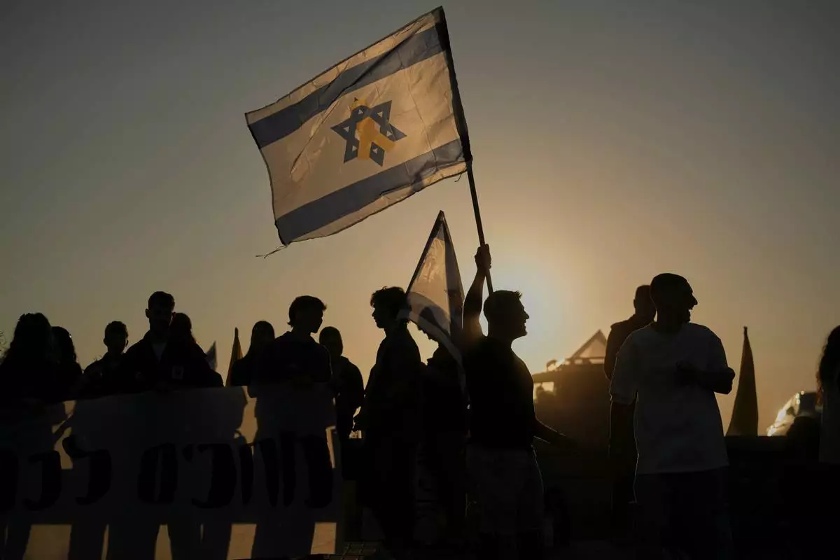 People hold Israeli flags as they gather before the release of Israeli hostages held in Gaza, outside a military base near Reim, southern Israel, on Monday, Oct. 13, 2025. (AP Photo/Leo Correa)