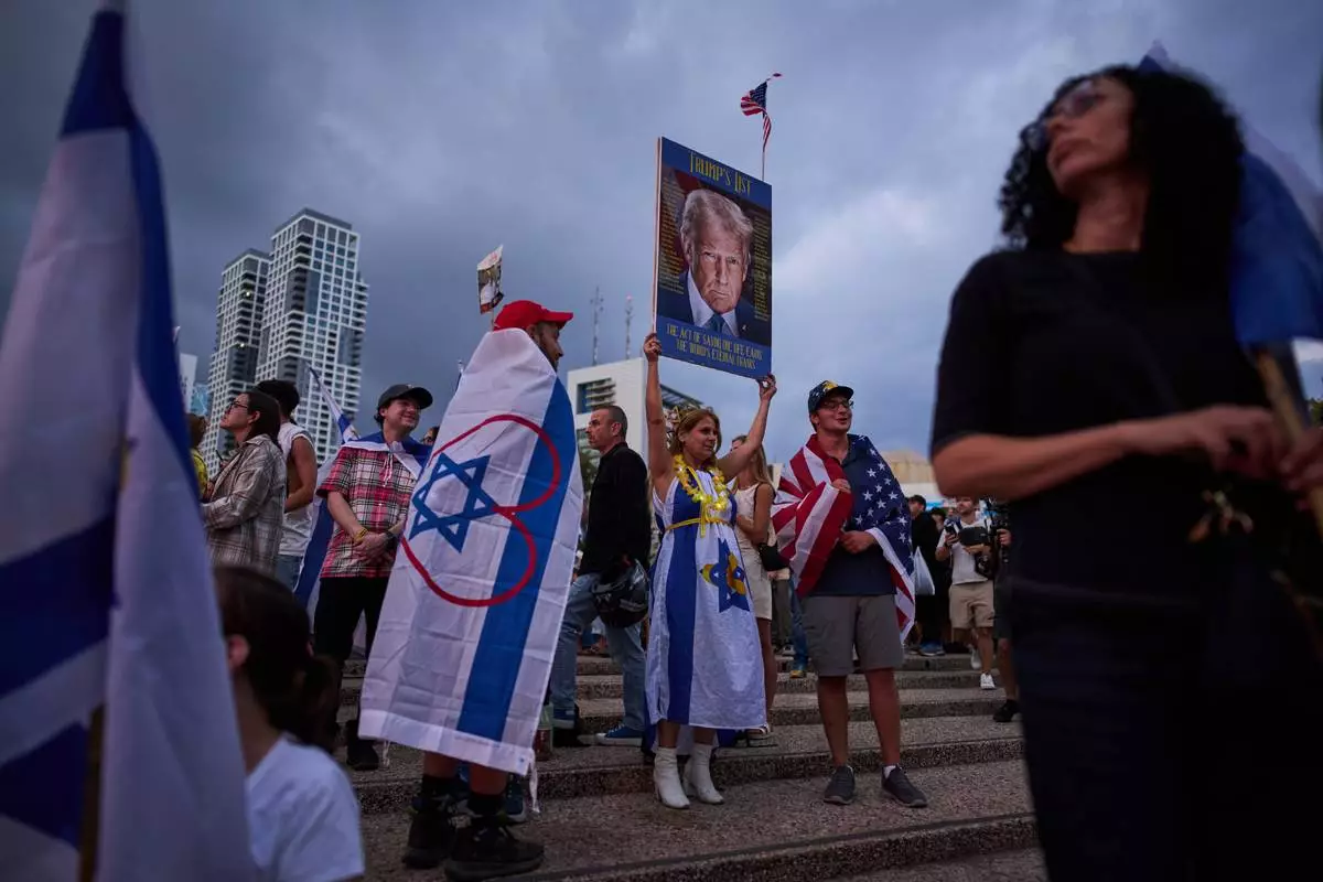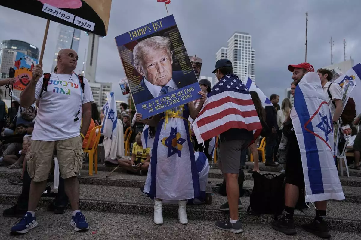 A woman holds an image of U.S. President Donald Trump during a gathering at a plaza known as hostages square in Tel Aviv, Israel, Monday, Oct. 13, 2025, before the release of Israeli hostages held in Gaza. (AP Photo/Oded Balilty)