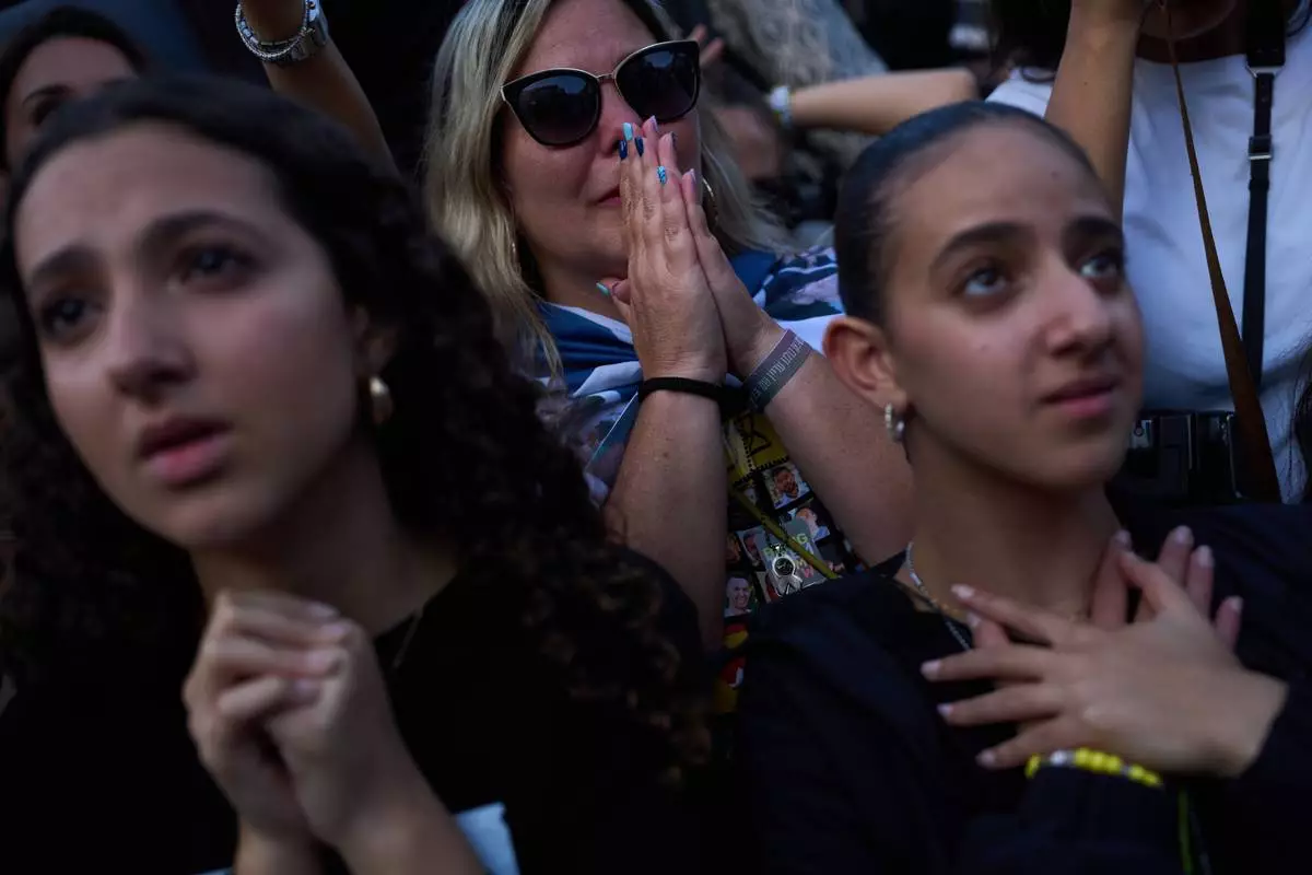 People react in anticipation of the release of Israeli hostages held in Gaza during a gathering at a plaza known as hostages square in Tel Aviv, Israel, Monday, Oct. 13, 2025. (AP Photo/Emilio Morenatti)