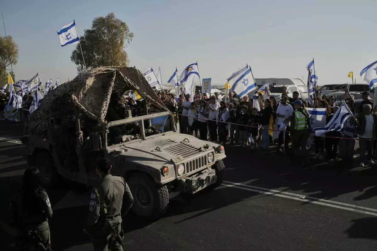 People wave Israeli flags as a military vehicle passes before the arrival of a convoy carrying hostages released from the Gaza Strip at a military base near Reim, southern Israel, Monday, Oct. 13, 2025. (AP Photo/Leo Correa)