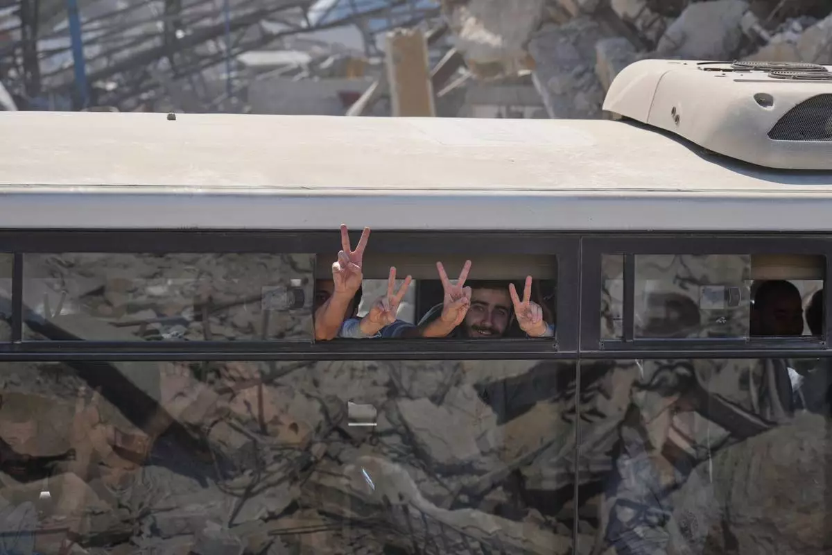 Freed Palestinian prisoners on a bus flash the victory sign as they pass destroyed buildings in the Gaza Strip after their release from Israeli jails under a ceasefire agreement between Hamas and Israel, in Khan Younis, southern Gaza Strip, Monday, Oct. 13, 2025. (AP Photo/Jehad Alshrafi)