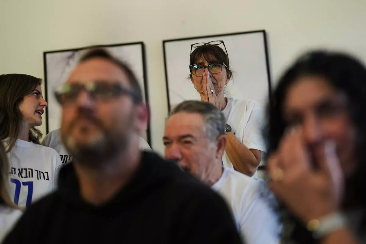 Family and friends of Israeli hostage Bar Kuperstein react as they watch the live broadcast of hostages being released from Hamas captivity in Gaza, in Holon, Israel, Monday, Oct. 13, 2025. (AP Photo/Francisco Seco)