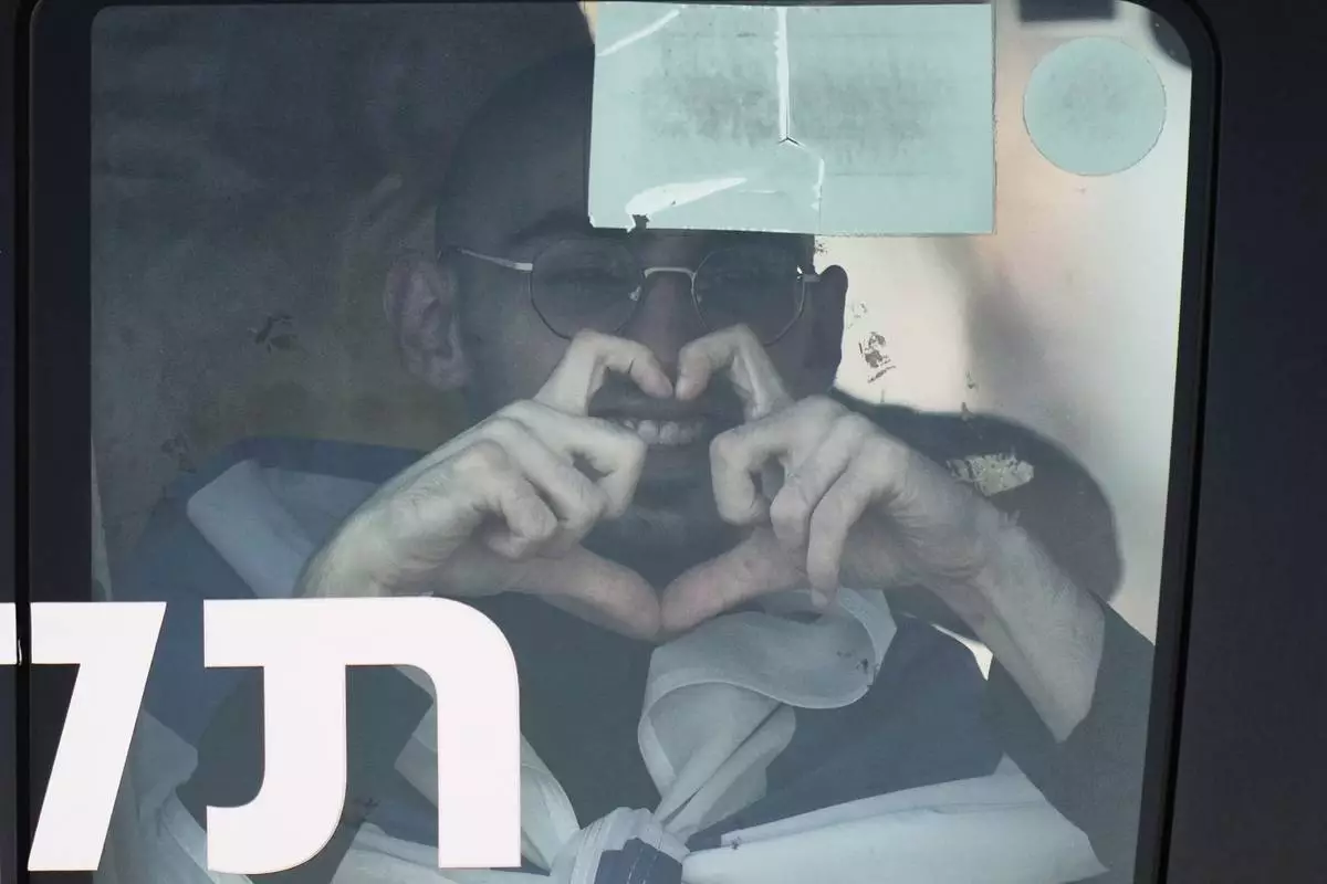 Rom Breslavski, an Israeli hostage released from the Gaza Strip smiles making a heart sign from a minibus at the Sheba Medical Center in Ramat Gan, Israel, Monday, Oct. 13, 2025. (AP Photo/Leo Correa)