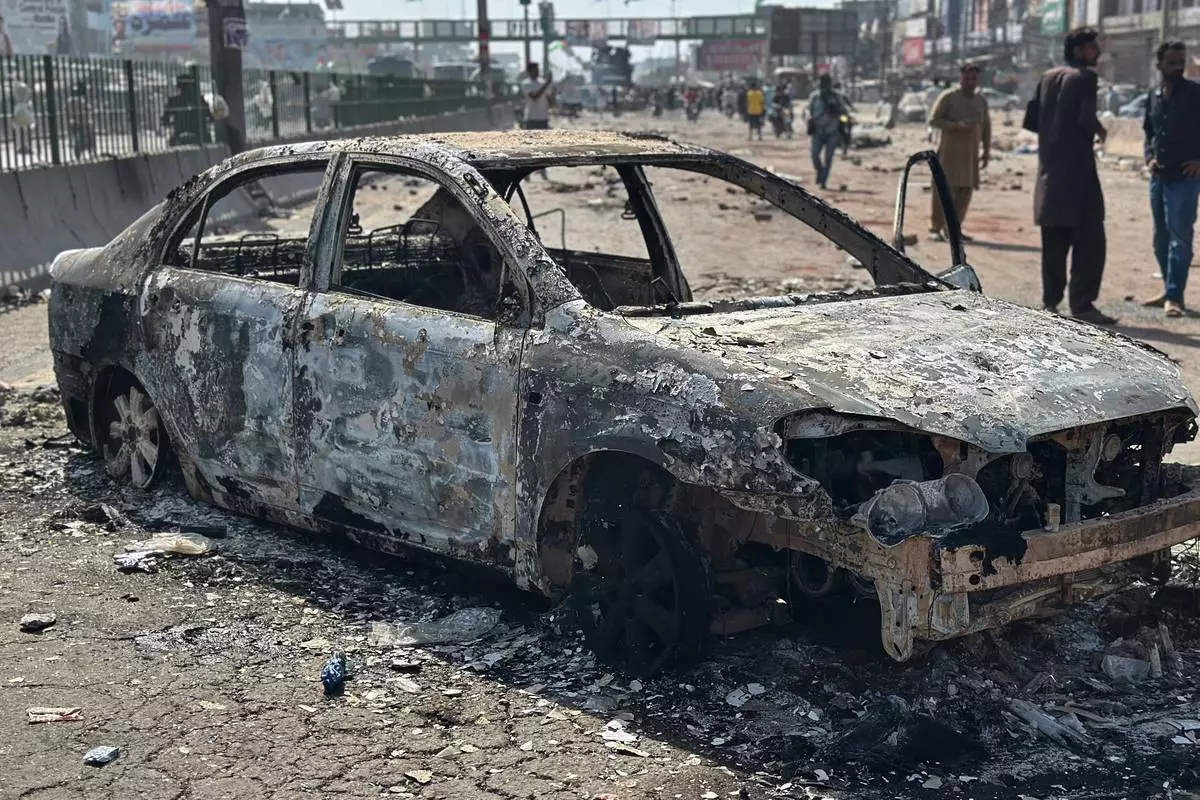 Local residents look at burnt vehicles after police in Pakistan clashed with thousands of protesters during a march in support of Palestinians, in Muridke near Lahore, Pakistan, Monday, Oct. 13, 2025. (AP Photo/Jahanzeb Khan)