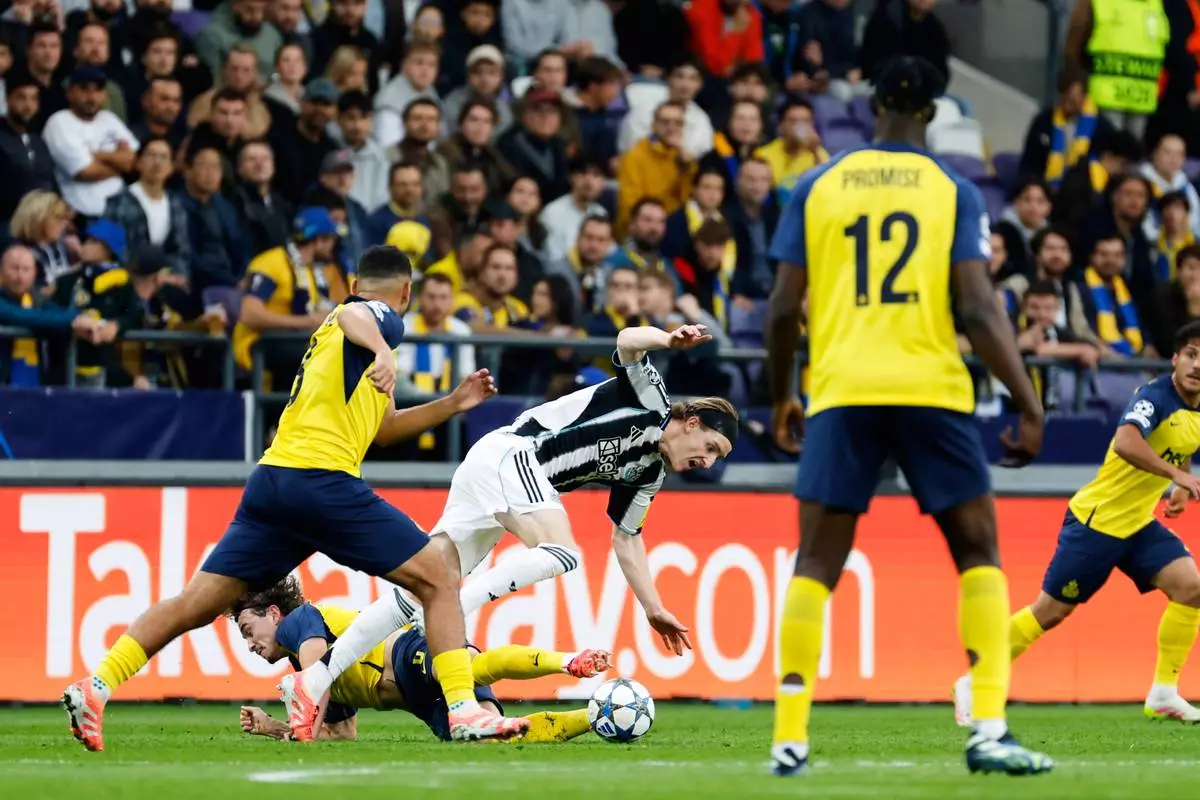 Newcastle's Anthony Gordon, center, fights for the ball with Union SG's Kamiel Van de Perre, left, during the Champions League opening phase soccer match between Union St. Gilloise and Newcastle United at the RSC Anderlecht stadium in Brussels, Wednesday, Oct. 1, 2025. (AP Photo/Geert Vanden Wijngaert)