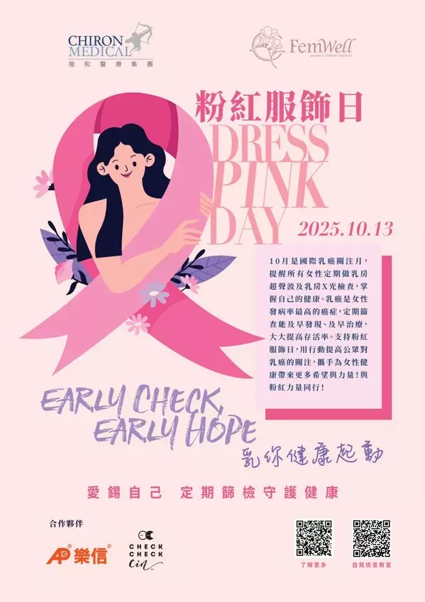 HONG KONG, Oct. 13, 2025 /PRNewswire/ -- According to government statistics[1], breast cancer ranks as the third leading cause of cancer deaths among women in Hong Kong, with an average of one in every 14 women likely to be diagnosed with the disease in their lifetime. The medical community widely believes that early detection significantly increases the success rate of treatment, making regular screenings and disease awareness essential. In celebration of Pink Day and International Breast Cancer Awareness Month, Chiron Medical invites all sectors to participate in launching "Early Check, Early Hope," which will kick off in October with a series of breast cancer awareness activities and limited-time Regular Breast Health Check-up offer to enhance women's understanding of breast cancer and promote healthy living.